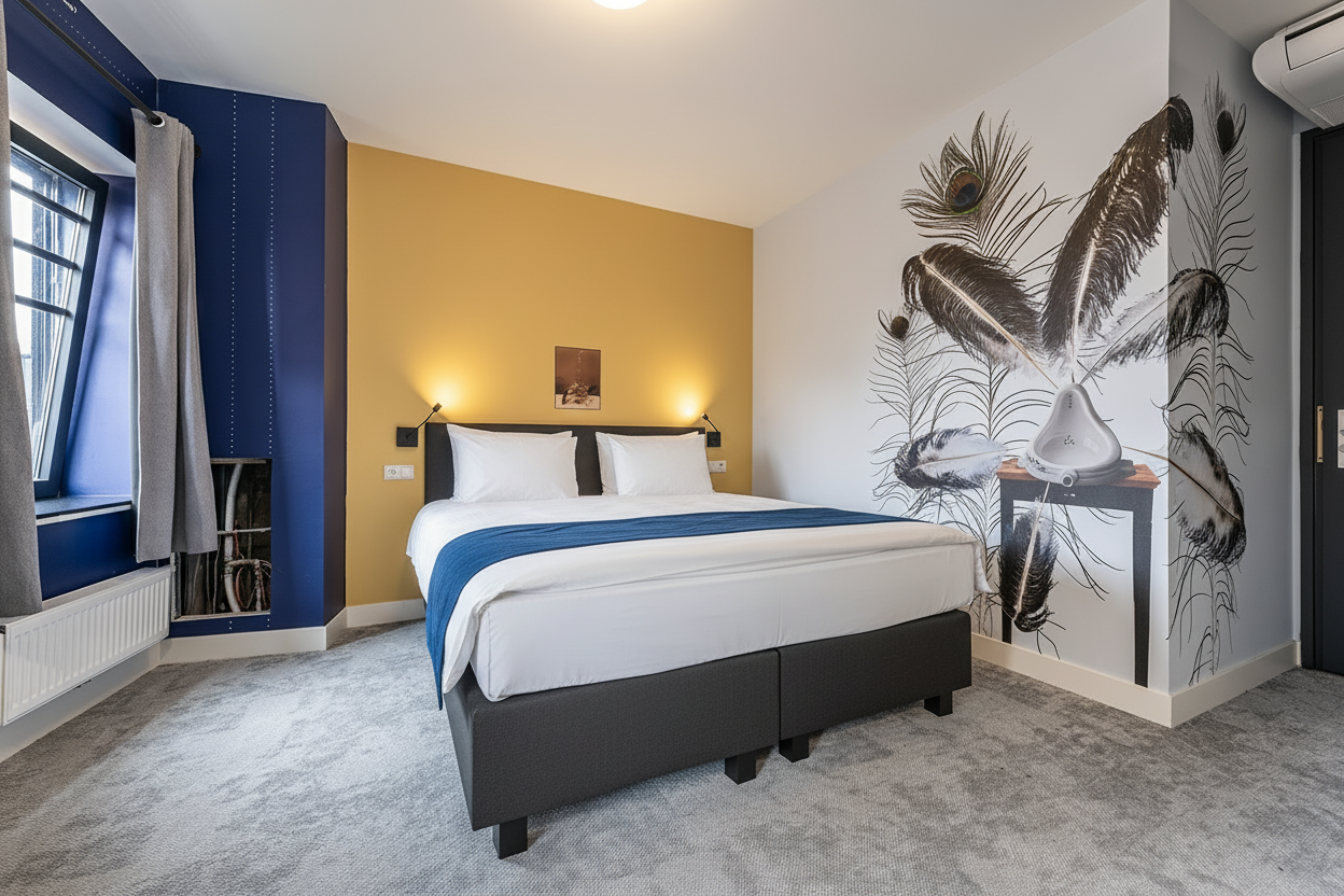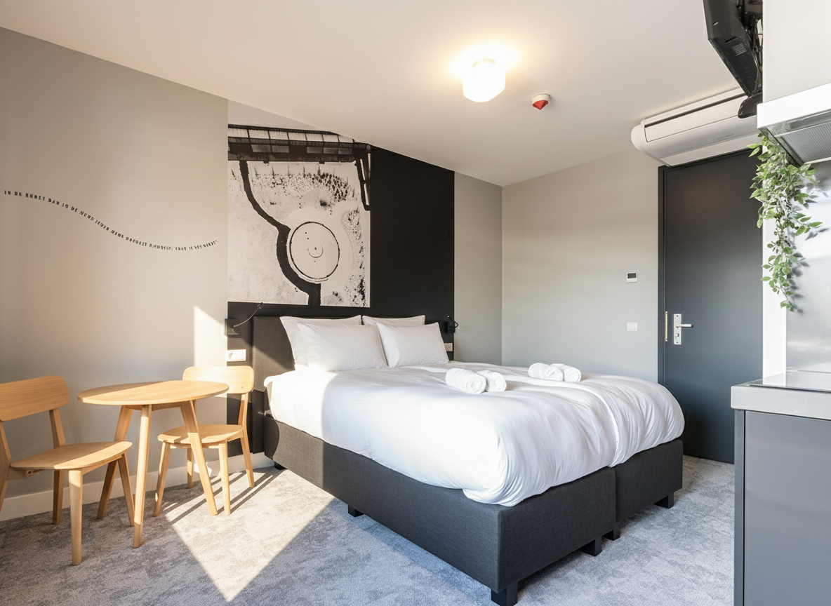 New, artist-inspired studio for 2 guests with a comfortable boxspring hotelbeds. Enjoy a private kitchen with induction hob, dishwasher, fridge, Nespresso, kettle, and cooking essentials. Air conditioning ensures a pleasant stay. Perfect for couples, solo travelers, or business trips, combining modern comfort with a creative, De Stijl-inspired atmosphere in the heart of the city. One of the art-rooms will be yours! they are all lovely and new