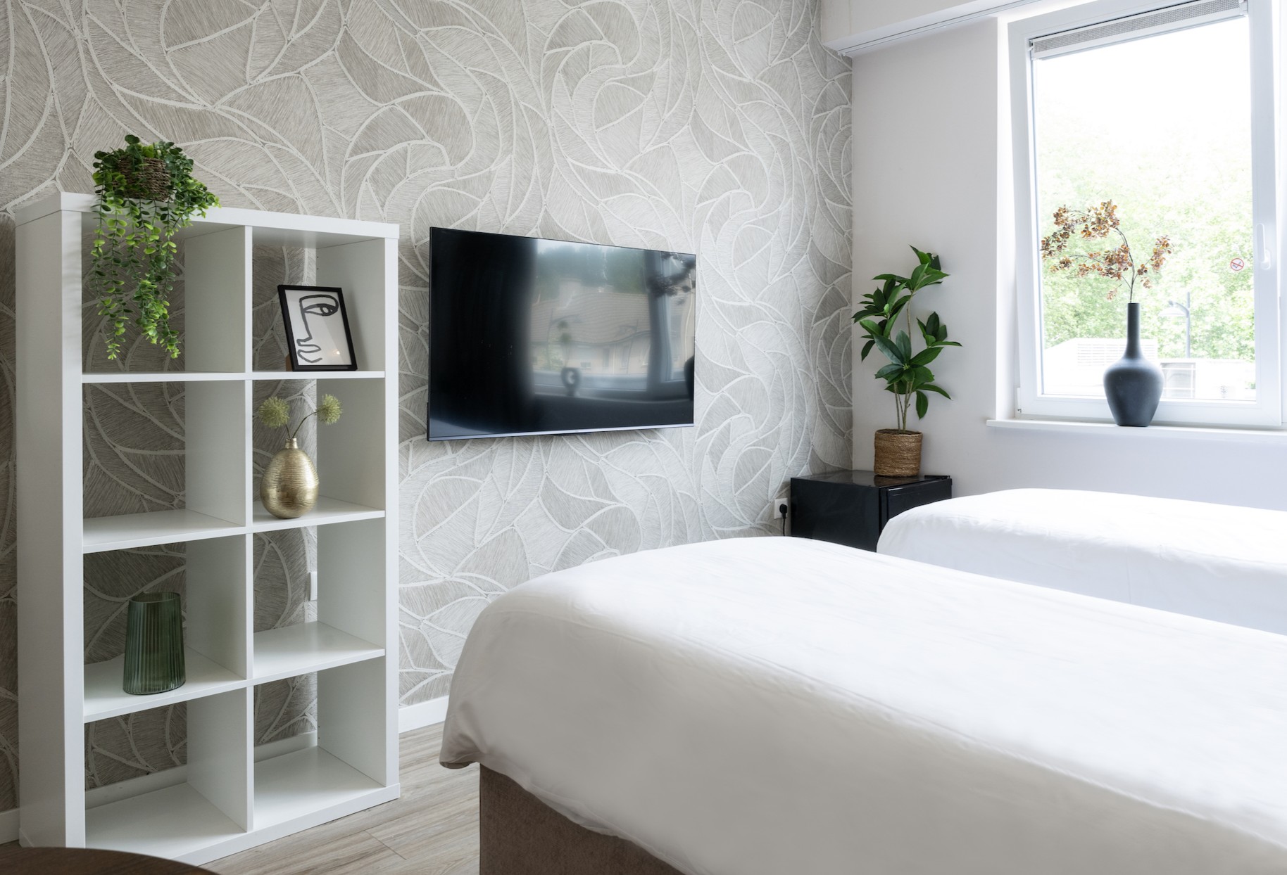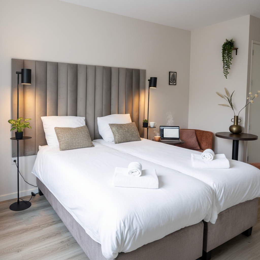 Comfortable and flexible room at Raamsdonksveer. Features 2 single beds that can be joined into a double, ideal for couples or solo travelers. Perfect for a relaxing stay with modern amenities and a cozy atmosphere.