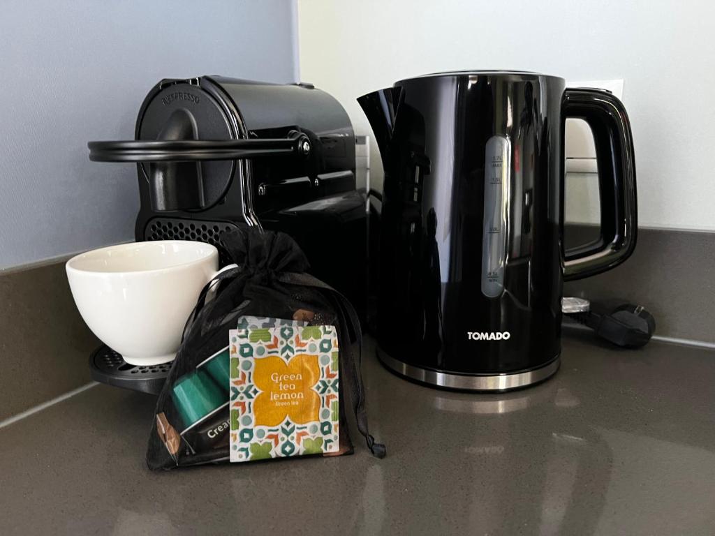 Kitchen & Dining – a private kitchen with stove, cooking basics, dinnerware, cutlery, coffee machine, kettle, and a cozy 4-seater dining table.